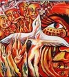 acrylic, enamel, and silver/gold leaf on canvas 5’x2’