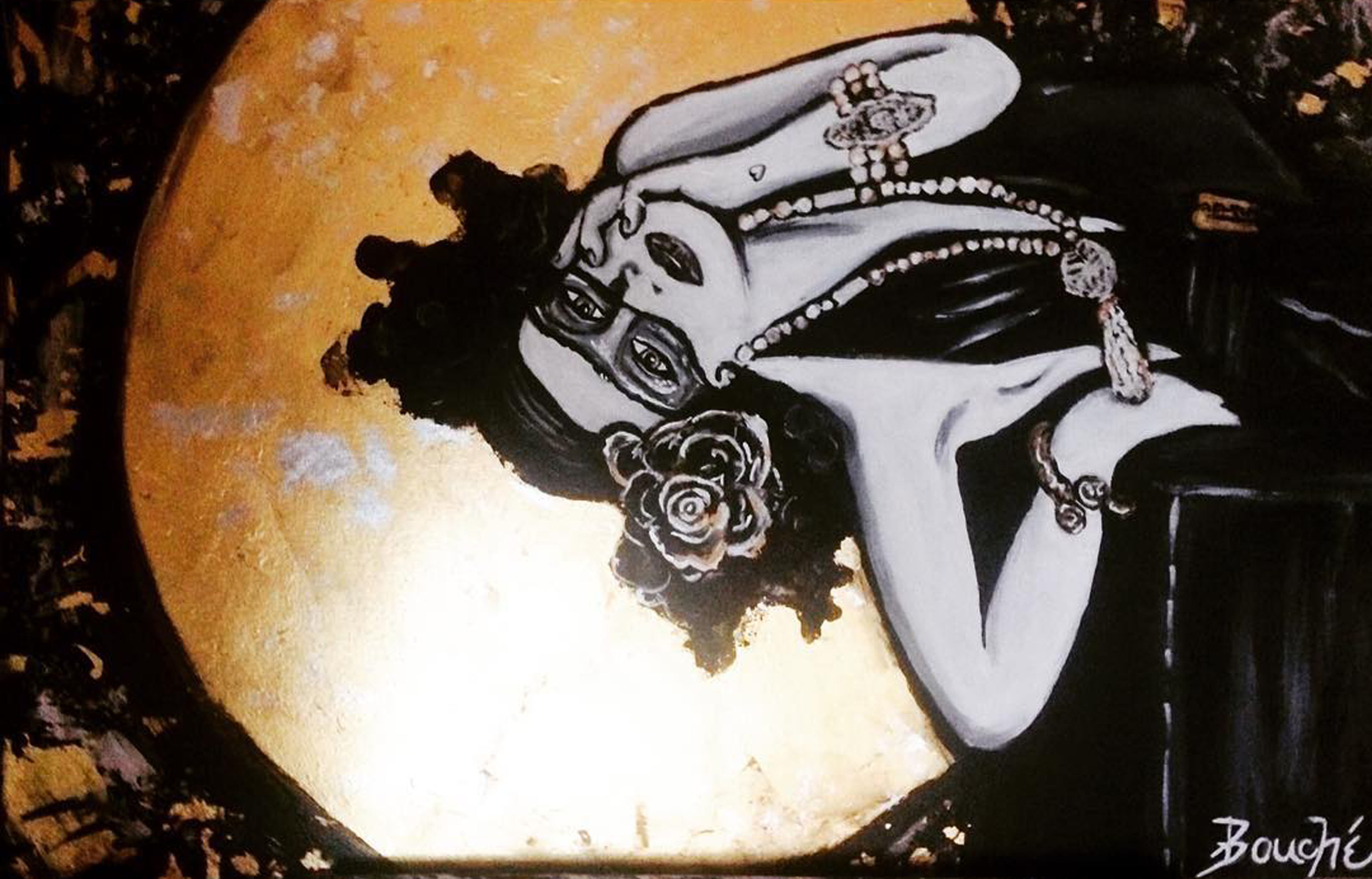 acrylic, enamel, and silver/gold leaf on canvas 5’x2’